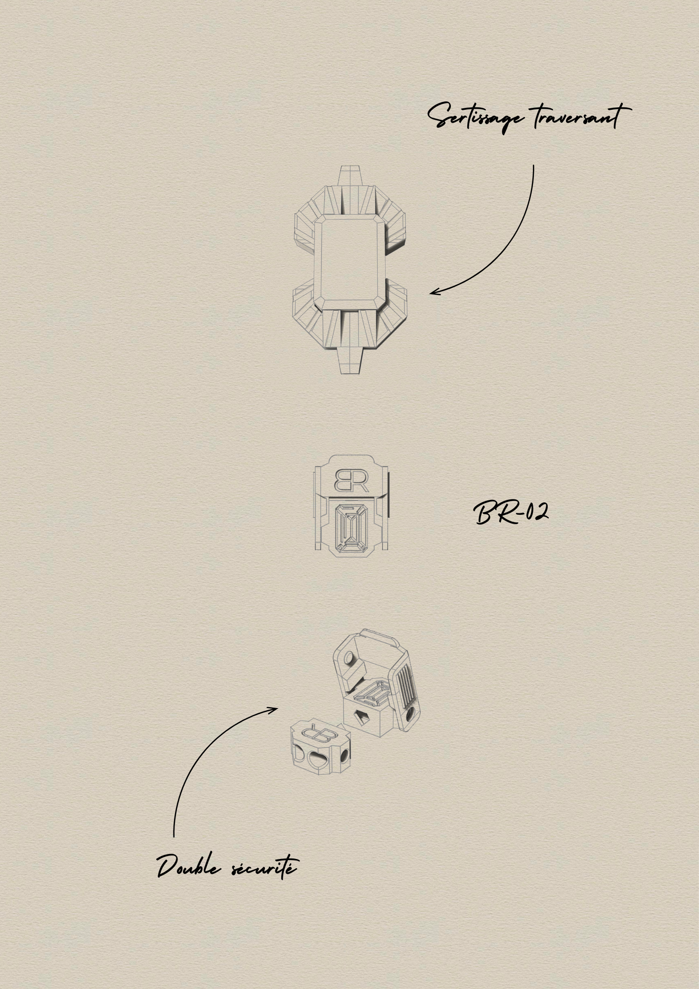 La Maison imagine une joaillerie contemporaine, reposant sur une architecture maîtrisée : cordon technique, fermoir inspiré de l’horlogerie et une pierre centrale, signature de la maison.