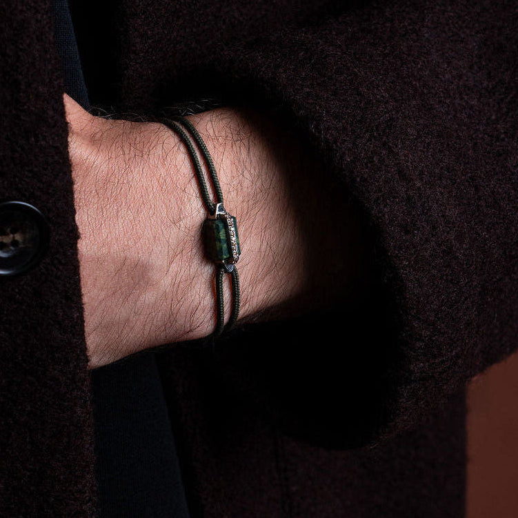 Le bracelet Limite acier et porphyre vert de Grèce incarne l’esprit d’accomplissement propre à la collection.